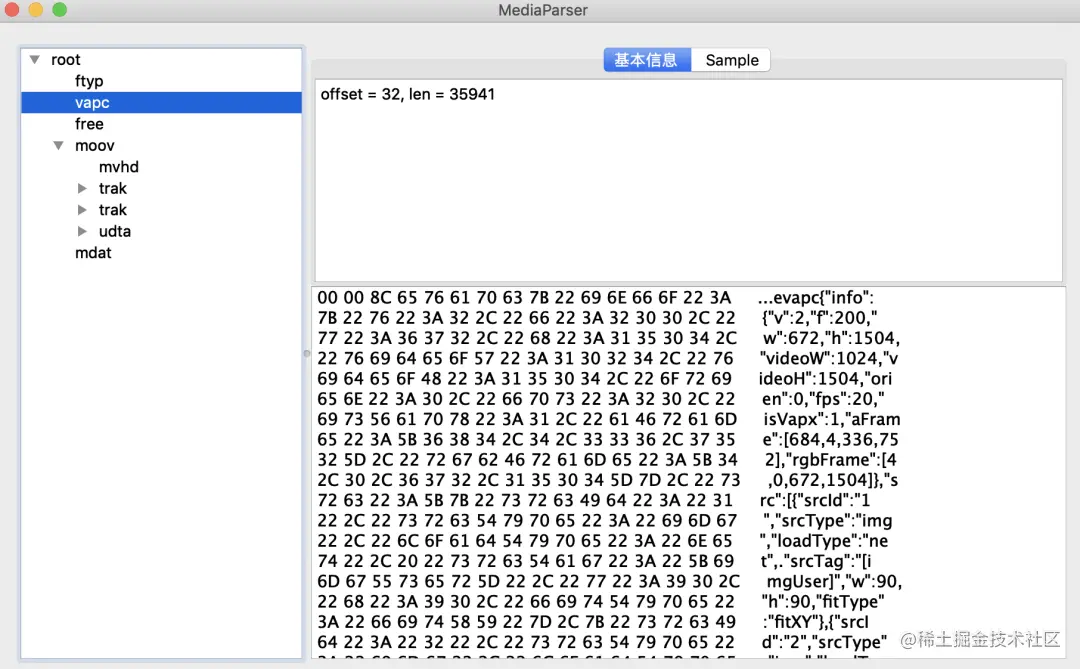 mp4的组织方式与JSON的key-value组织方式很像,被称为一个BOX,我们创建一个新的BOX(vapc VAP Config),JSON内容放到这个BOX里,播放前先读取此BOX然后播放(ps: mp4规范里定义如果无法识别的BOX自动忽略,不影响mp4正常播放流程)。