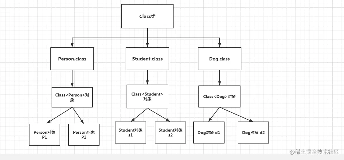 在创建任何类的对象之前,JVM会首先创建给类对应的Class对象,每个类仅对应一个,如果已经创建则不再创建。然后在创建该类的时候,用于获取该类的元信息。