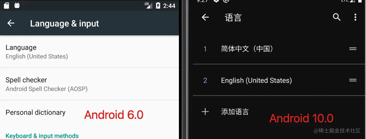 - Android 系统间不同的差异,例如 7.0 后不再是唯一默认语言,而是多种语言配置,具体差别如下所示: