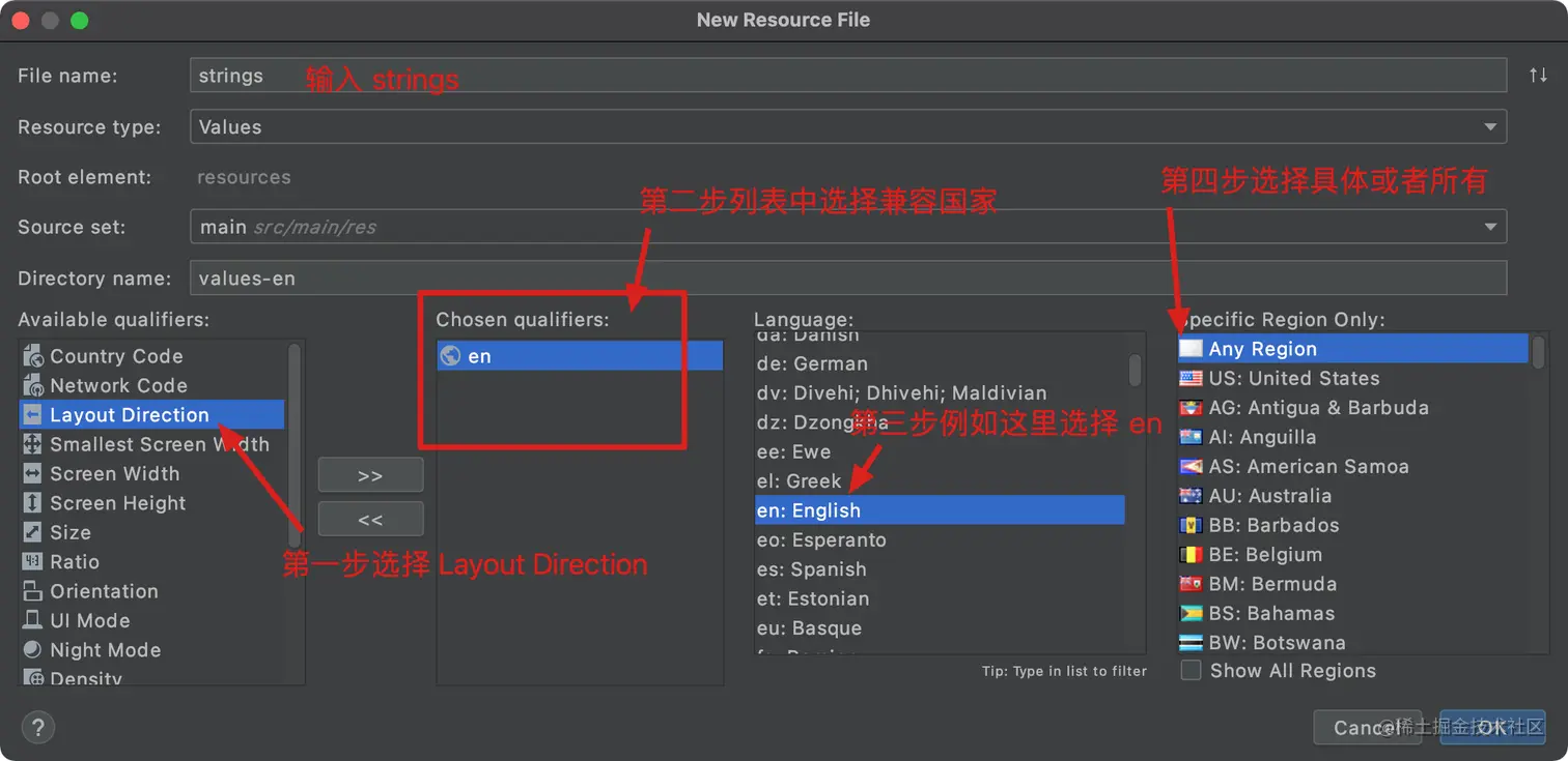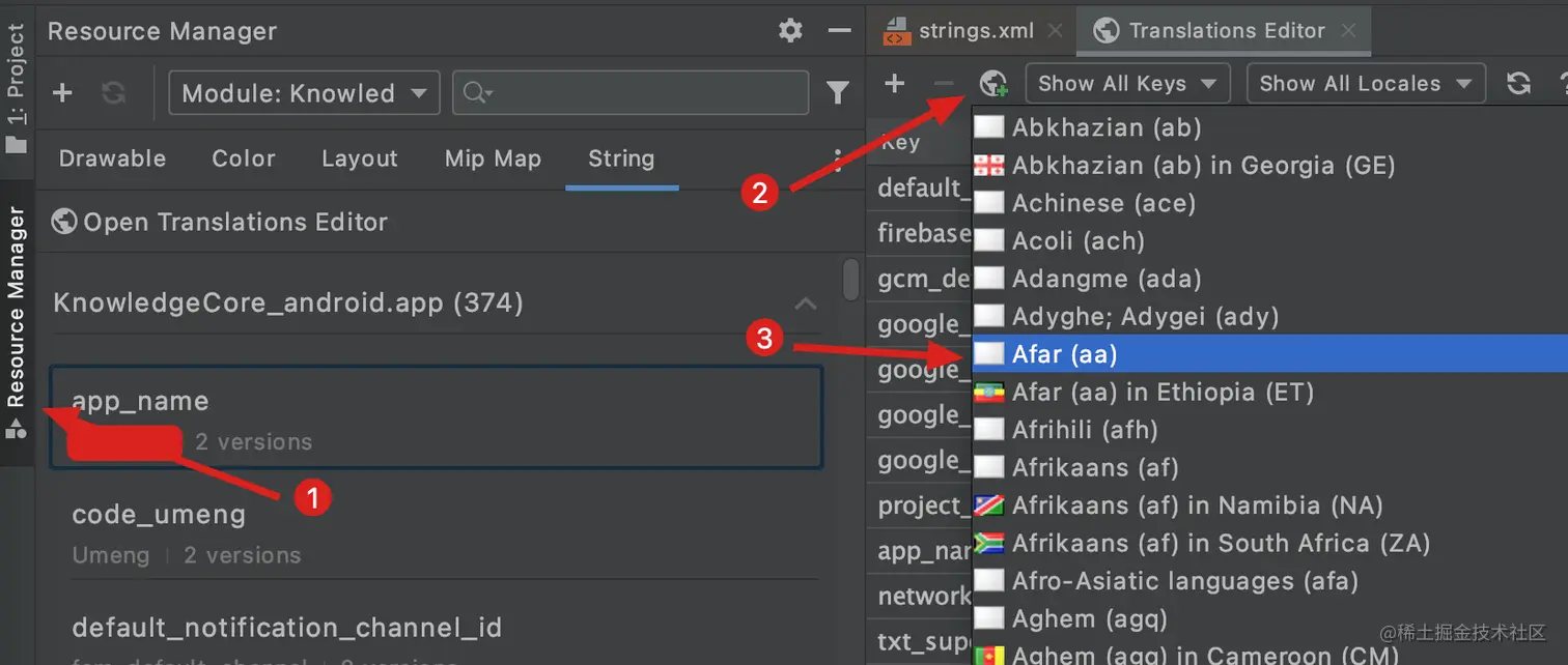 Android Studio 左侧选择「Resource Manager」,随后选择小地图 + 的标志,最后在列表中选择对应兼容的国家即可.