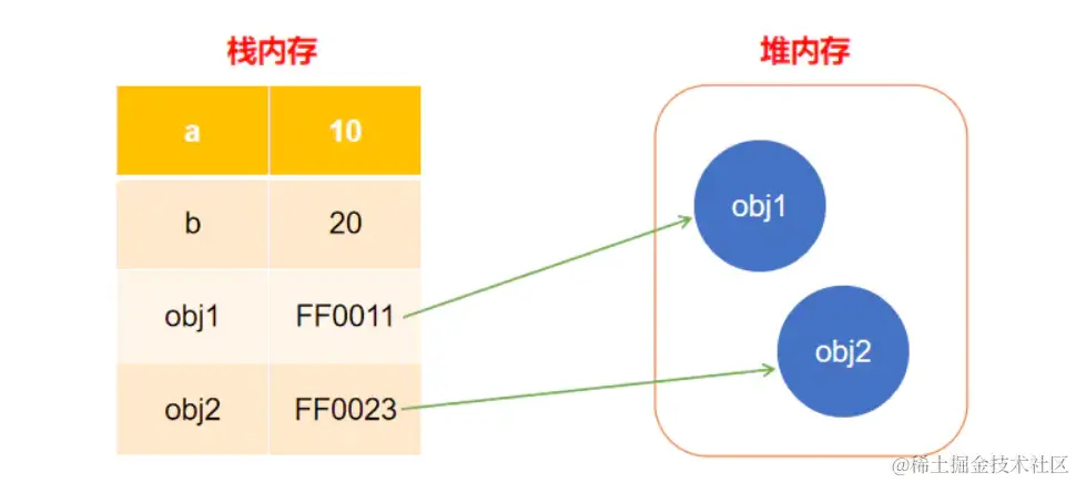 原始类型(存放在栈内存中)和对象类型(存放在堆内存中)分别在内存中的存在形式如下图所示: