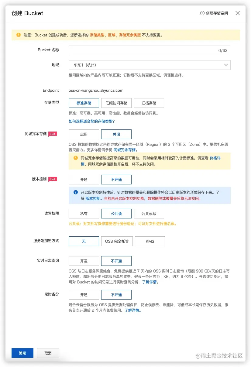 - 读写权限:这里要注意,我们选择公共读,切记不能选择私有,一方面如果不开启CDN的话,私有权限无法在公网访问。另一方面,如果开启CDN,阿里云的CDN私有回源功能与OSS的静态页面功能冲突(别问我是怎么知道的,都是坑)