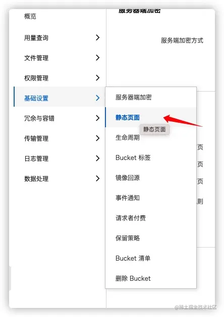 进入Bucket的配置页面,选择“基础设置-静态页面”: