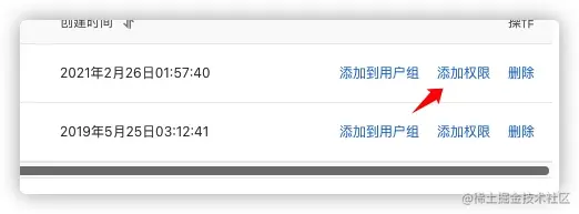 返回以后,点击刚创建的账户右侧的“添加权限”: