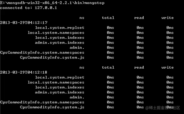 启动你的Mongod服务,进入到你安装的MongoDB目录下的bin目录, 然后输入mongotop命令,如下所示: