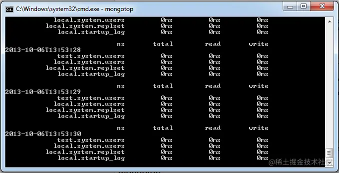 跟踪一个MongoDB的实例,查看哪些大量的时间花费在读取和写入数据 mongotop也是mongodb下的一个内置工具,mongotop提供了一个方法,用来跟踪一个MongoDB的实例,查看哪些大量的时间花费在读取和写入数据。 mongotop提供每个集合的水平的统计数据。默认情况下,mongotop返回值的每一秒。