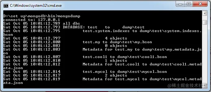 在本地使用 27017 启动你的mongod服务。打开命令提示符窗口,进入MongoDB安装目录的bin目录输入命令mongodump: