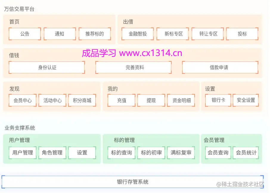 万信金融 包括万信交易平台和业务支撑系统两个核心子系统,各个子系统又分为六个模块