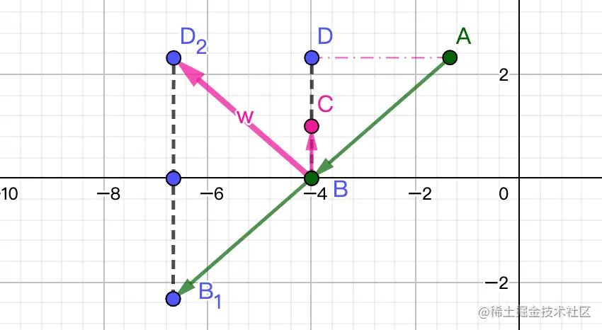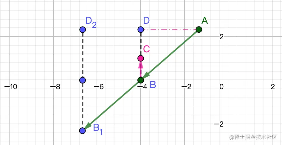 因为向量是可以平移的,这里我们对 AB 进行移动,即方便相加,也在几何上构成四边形,更容易理解。下图中,BB1 = AB,而 B1D2 = 2 * BD。可知,BD2 就是要求的反射向量,而 BD2 = AB + 2 * BD。
