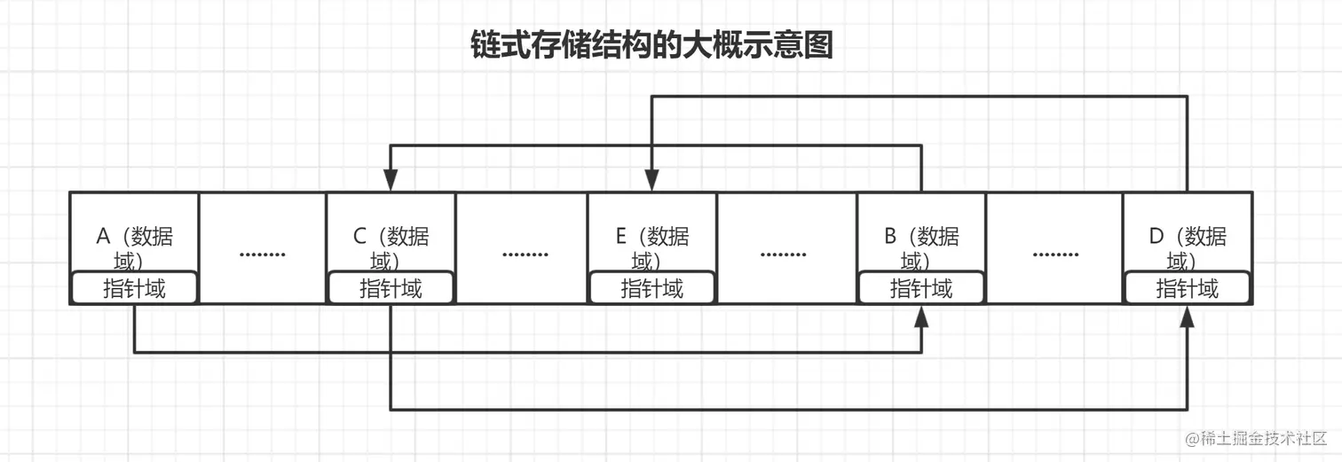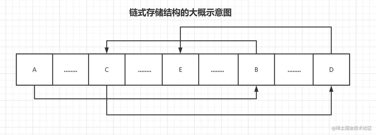 在图中A,B,C,D,E这五个元素,存储的位置都不是顺序的,但是A的下一个元素要指向B,B的下一个元素要指向C,等等这种顺序,要通过什么方式来表明呢?