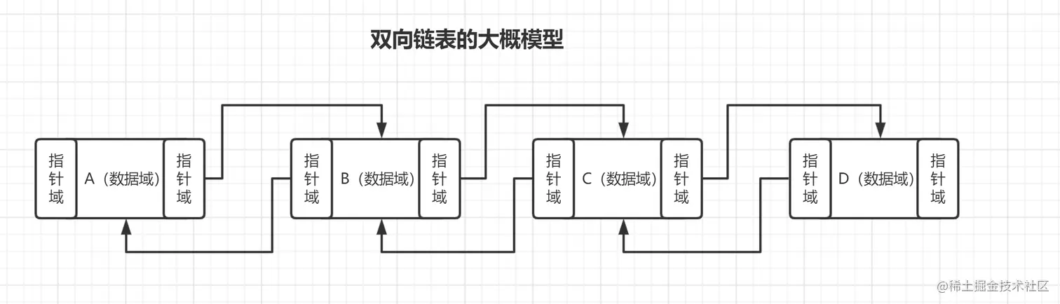 如果一个数据元素,既有指向下一个元素的指针域,也有指向上一个元素的指针域,那么这种结构就是双向链表。如图所示: