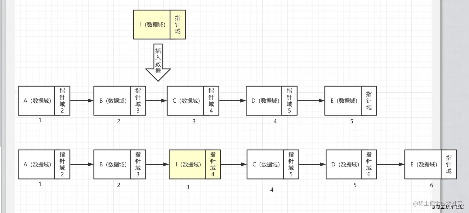 单向链表的插入和删除都是特别简单的逻辑,在之前我讲述链式存储结构的时候,其实已经通过画图说明链式存储结构了,而那个时候的例子就是单向链表,下图就是当初那张图: