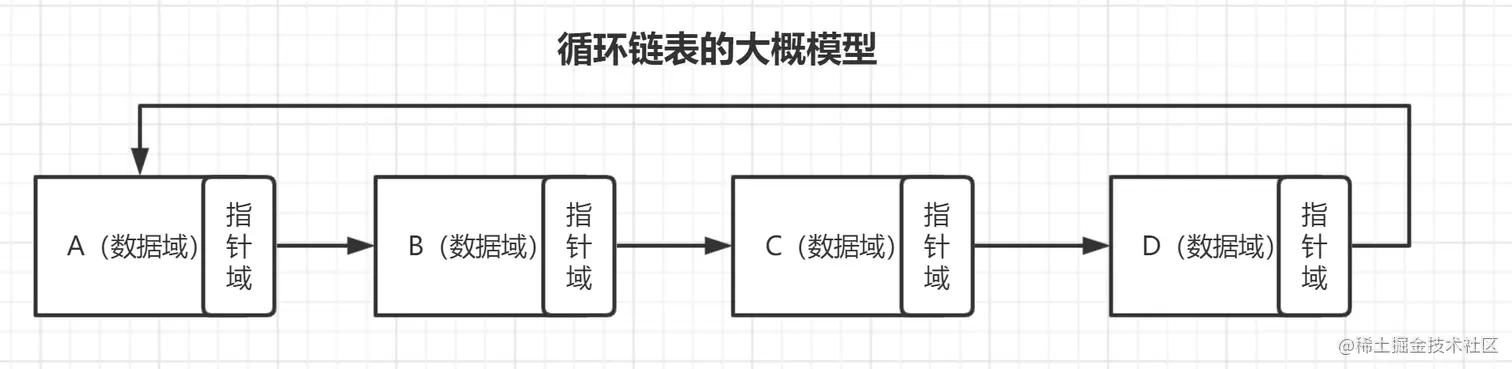 那么,假如我们让单向链表的最后元素的指针域指向了单向链表的第一个元素,这种结构叫什么呢?这就是循环链表。如图所示: