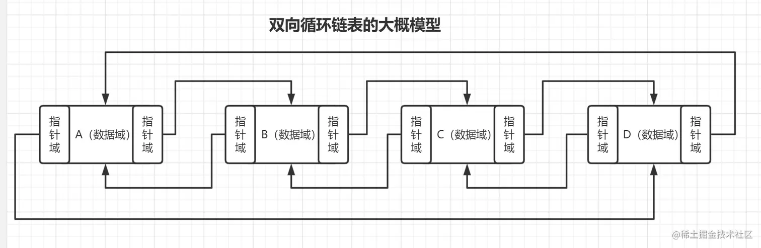 在单向链表的基础上,任意一个元素,既可以访问它的前驱节点,也可以访问它的后继节点,而且最后一个元素的后继节点指向第一个元素,第一个元素的前驱节点指向最后一个元素,那么这种数据结构,我们称之为双向循环链表结构,如图所示: