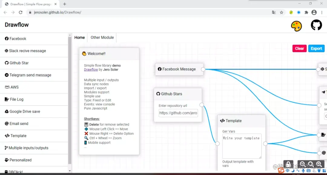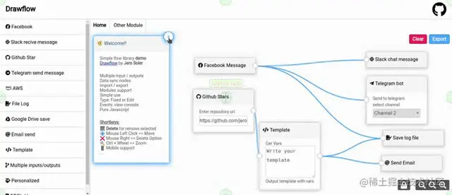 【导语】:Drawflow可以用来快速创建数据流,支持节点拖拽、多重连接、数据节点同步、数据模块清除、移动端设备友好等功能。