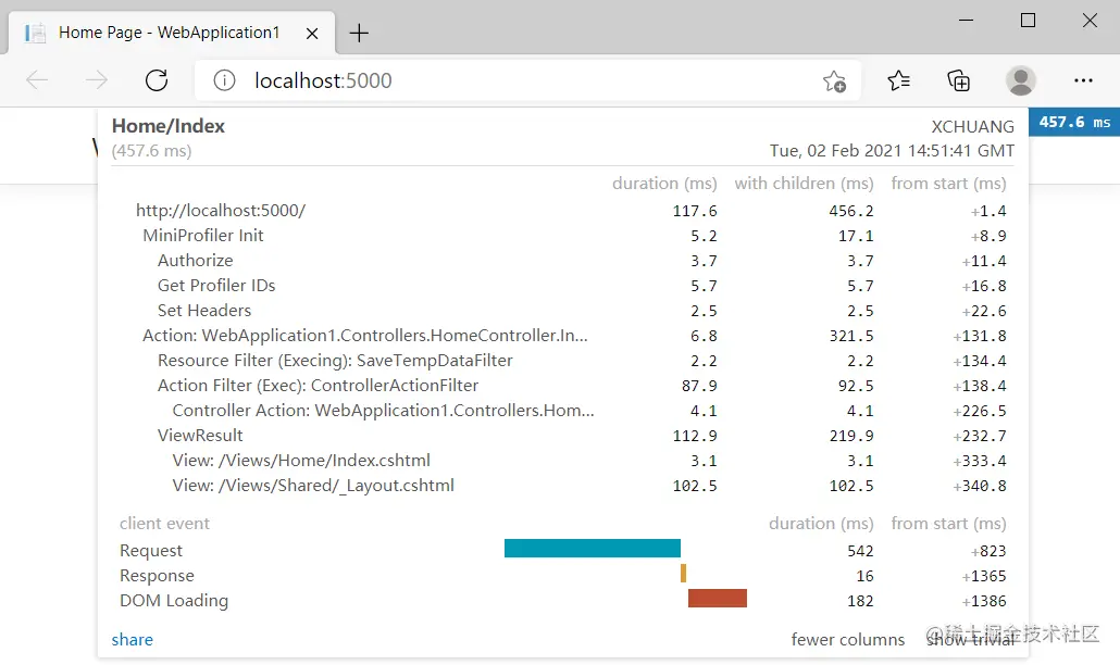 MiniProfiler 会提供 页面加载时间 和 数据库查询性能指标,接下来把程序跑起来,你会看到如下的性能指标图。