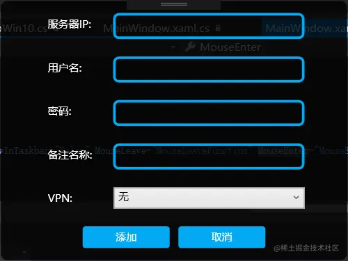 那么远程服务器的ip、密码、账号信息从哪里来?当然是从我们的服务器了,程序启动后从服务器获取这些信息集合,那么就的有个添加信息的窗口,可以随时添加服务器信息。