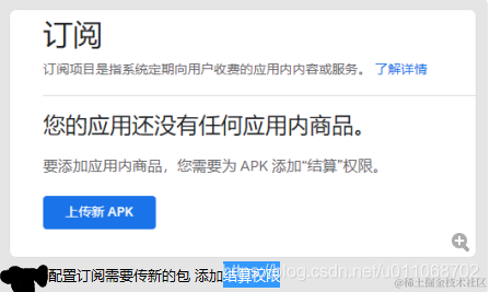 Android之提示订阅配置订阅需要传新的包 添加结算权限。 chenyu 2021-02-28 157 阅读1分钟 1 问题 apk上google应用市场,然后开通支付商品,错误提示如下 2 解决办法 AndroidManifest.xml里面添加谷歌支付权限 <!-- google pay --> <uses-permission android:name="com.android.vending.BILLING" />