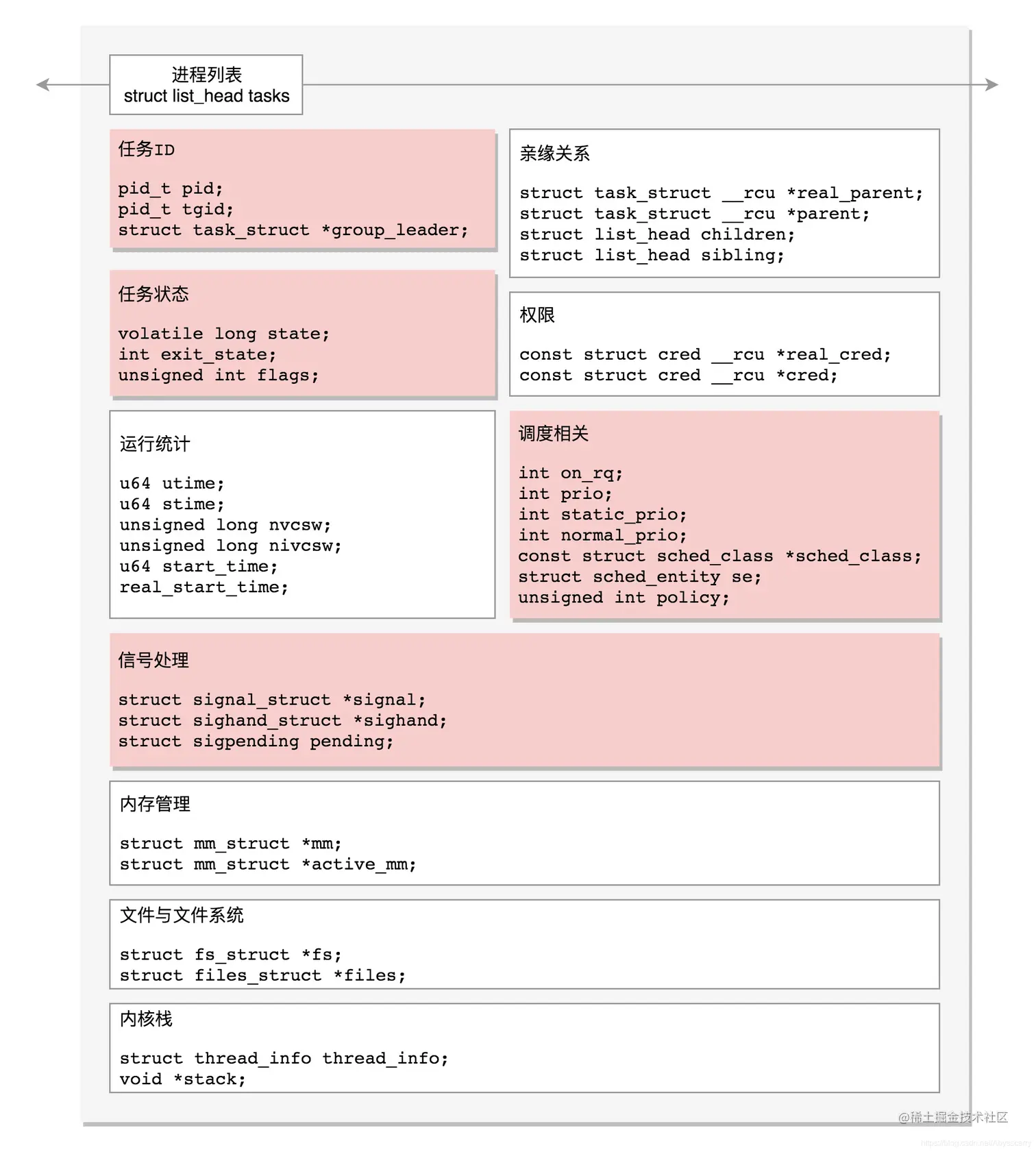 在Linux 里面,无论是进程,还是线程,到了内核里面,我们统一都叫任务(Task),由一个统一的结构 task_struct 进行管理,这个task_struct 数据结构非常复杂,囊括了进程管理生命周期中的各种信息。