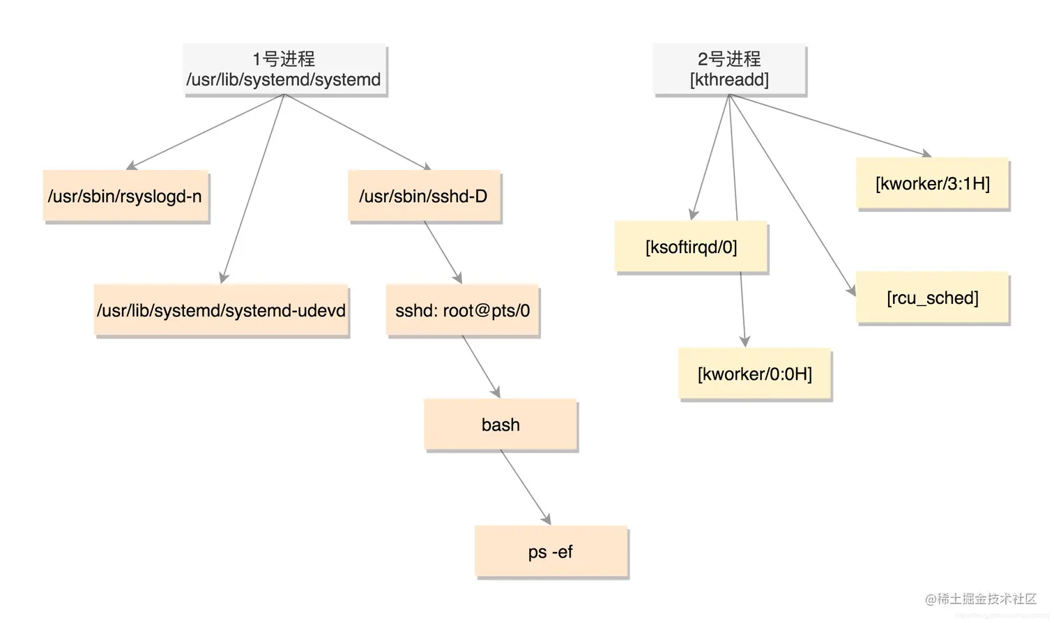 在Linux操作系统内核初始化时会创建第一个进程,即0号创始进程。随后会初始化1号进程(用户进程祖宗:/usr/lib/systemd/systemd),2号进程(内核进程祖宗:[kthreadd]),其后所有的进程线程都是在他们的基础上fork出来的。