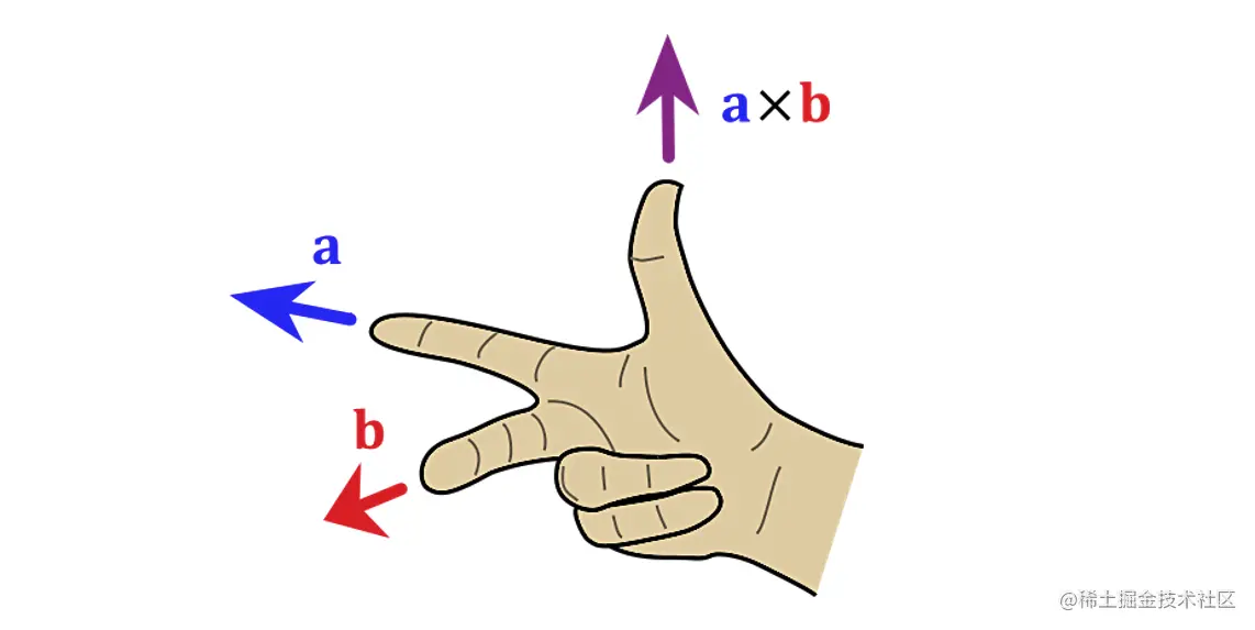 这也是上篇提到的右手定则。其实我们也可以使用更加简单的右手螺旋定则来确定叉积的方向。例如上图中的向量a叉乘向量b,我们伸出大拇指,将剩下四个手指并排伸开,按照从a到b的方向旋转,这样大拇指所指的方向就是两个向量叉积的方向了。