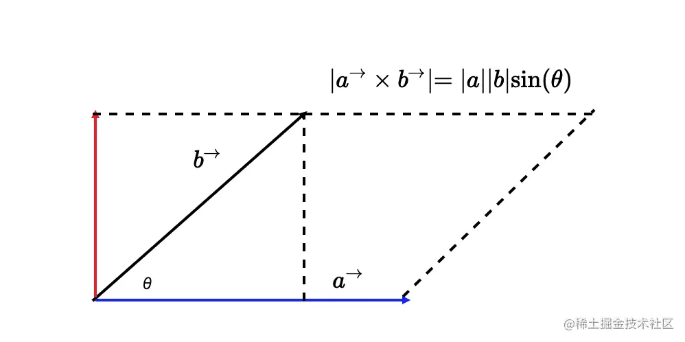 如上所示,在二维空间中,向量的叉乘运算就是两个向量围成的平行四边形的面积,或者说是向量a与(向量b在向量a的垂直方向,也就是红色箭头线段上的投影)的乘积,也就是红色和蓝色箭头围成的矩形面积。(这段话比较绕,需要好好体会)。
