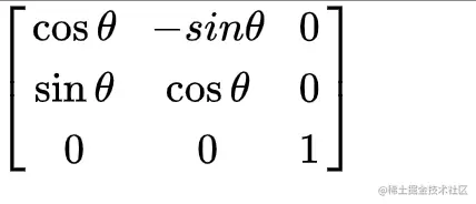 在二维空间中,一般是绕z轴进行旋转,也存在绕x或y轴旋转,不过逻辑都是一样的,绕哪一条轴旋转,那么那个轴的坐标就不变,这里我们还是以绕z轴做示例,所以二维平面中,z的坐标不变,于是可以得到一个3X3的旋转矩阵。