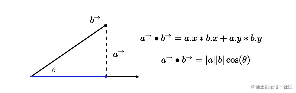 上图第一个式子很容易理解,就是两个向量的坐标相乘以后相加。而第二个式子也是在图形学中有非常重要的应用。其实根据上图也能容易看出向量b的长度乘以他们的夹角,实际就是这个直角三角形的底边。