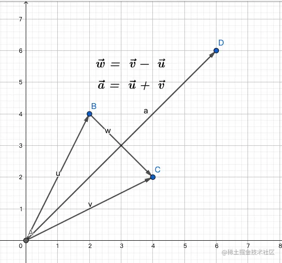 然后我们来验证下向量加减是这么去计算的,按照图上的坐标,很容易就能得到下面的结果: