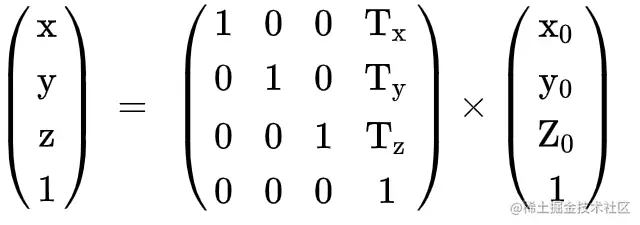 但是由于平移无法写成M*X这样的线性表示,也就无法写出一个3X3的矩阵,为了让变换保持一致,所以又添加了一个维度,使之变成了4X4的矩阵,把最后一个维度设置为1,于是我们来改写一下上面的平移方法
