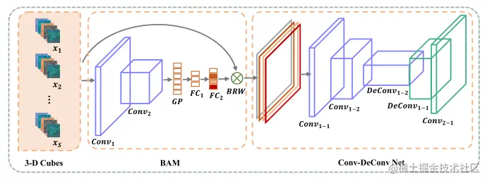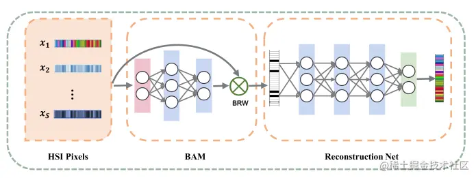 总体网络结构如上图所示,其核心思想是首先根据原始的高光谱图像生成波段注意力模型(Band Attention Module, BAM),而后使用波段权重重采样模块(Band reweighting, BRW)对波段应用注意力,最后使用重建网络RecNet(reconstruction network)根据应用注意力后的图像重建原始图像,并使得重建误差最小化。