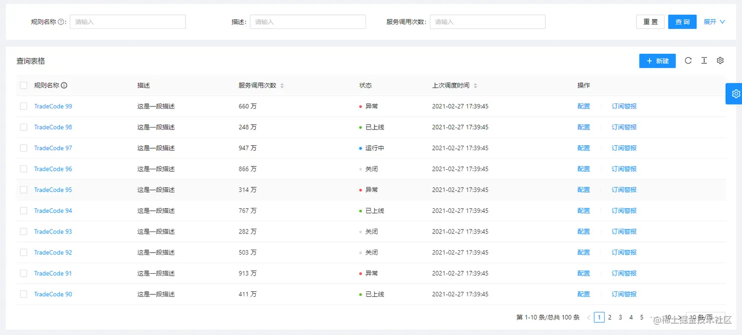 那就是上面是搜索,下面是带分页的表格。ant design 组件库已经非常贴心的帮我们把表格组件和分页组件封装在了一起。我们只需要修改 column、dataSource 等属性就可以实现不同的页面。写的页面多了,会发现在仍然有一些重复逻辑,那就是请求数据的逻辑:页码修改的时候需要重新请求数据;查询条件修改的时候还要触发请求数据的逻辑。鉴于此,我们将这些逻辑抽取出来,借助 ant design 组件封装一个包含请求数据的表格组。效果: