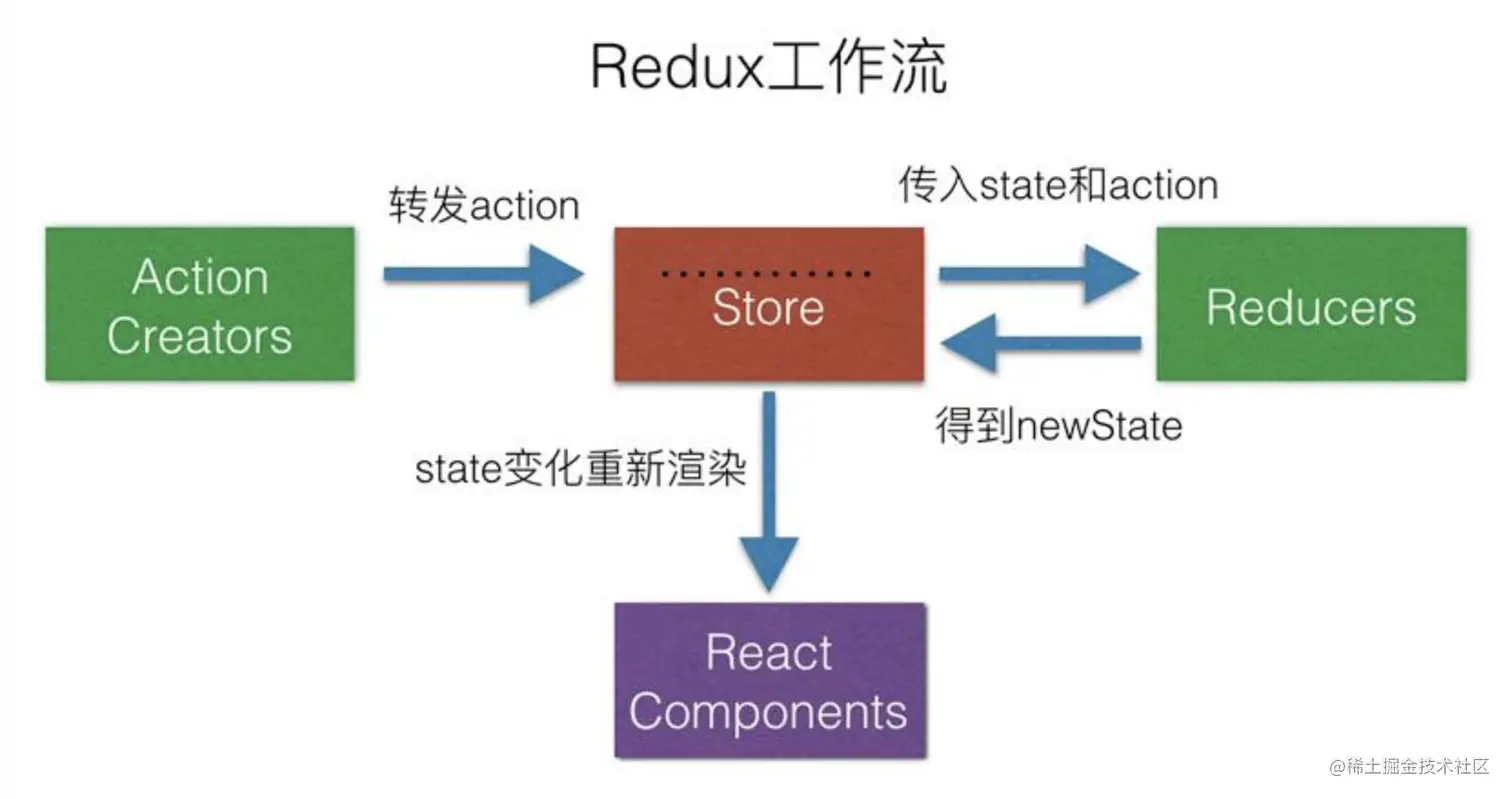 - 组件派发action给store里的reducer, reducer计算并返回新的state, store更新state,并通知订阅它的组件进行重新渲染