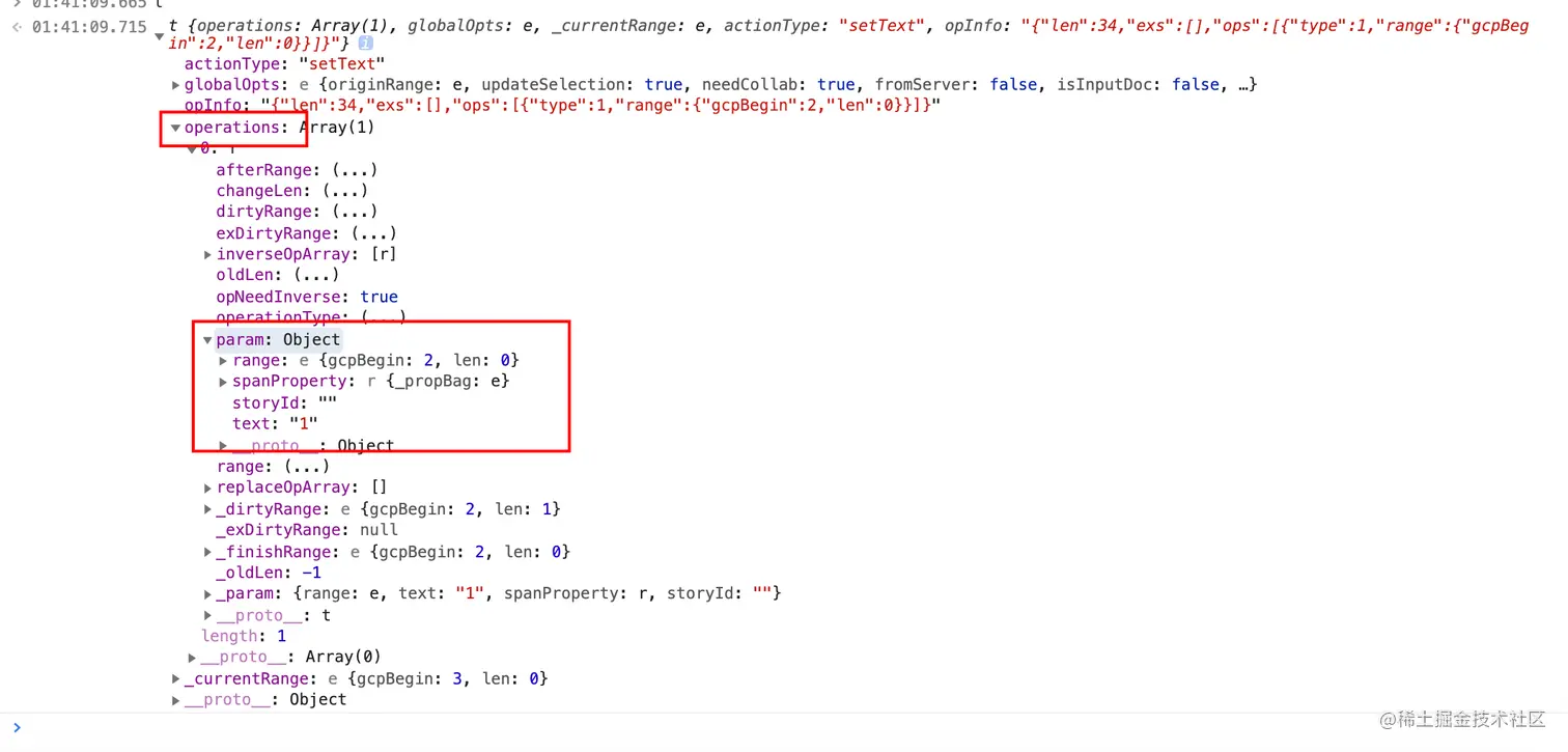 我们进入到它的applyDelta这个函数,然后把它的参数打印出来,重点看红框部分,range指的是输入前选区的位置,text指的是输入的内容(我在原有的12后面输入了一个1),这个就是变更operations。