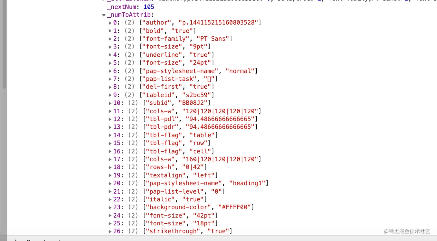 我们继续看上图中的_numToAttrib,这是文档中的属性集,将其展开,如下图所示,比如["bold", "true"],它的意思是bold属性的值是"true",表示的是加粗;再比如["font-family", "PT Sans"],意思是字体是PT Sans。