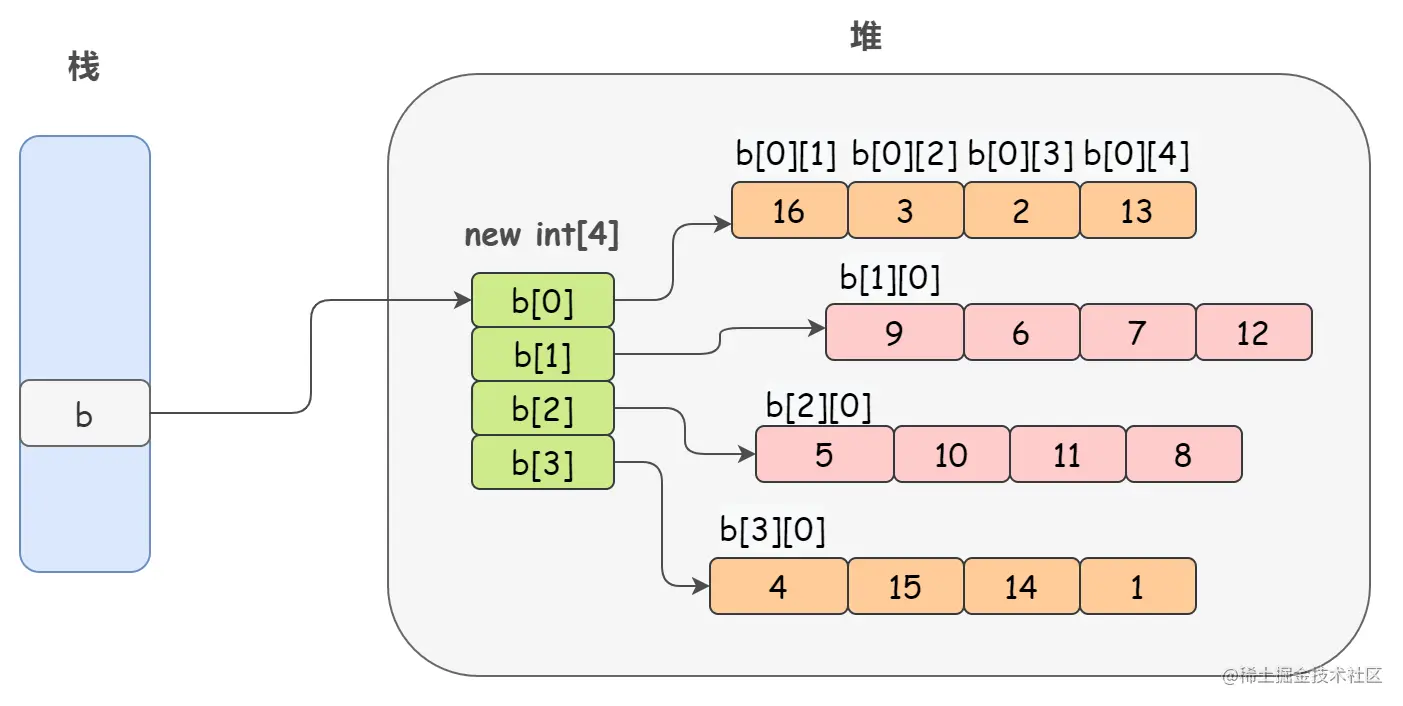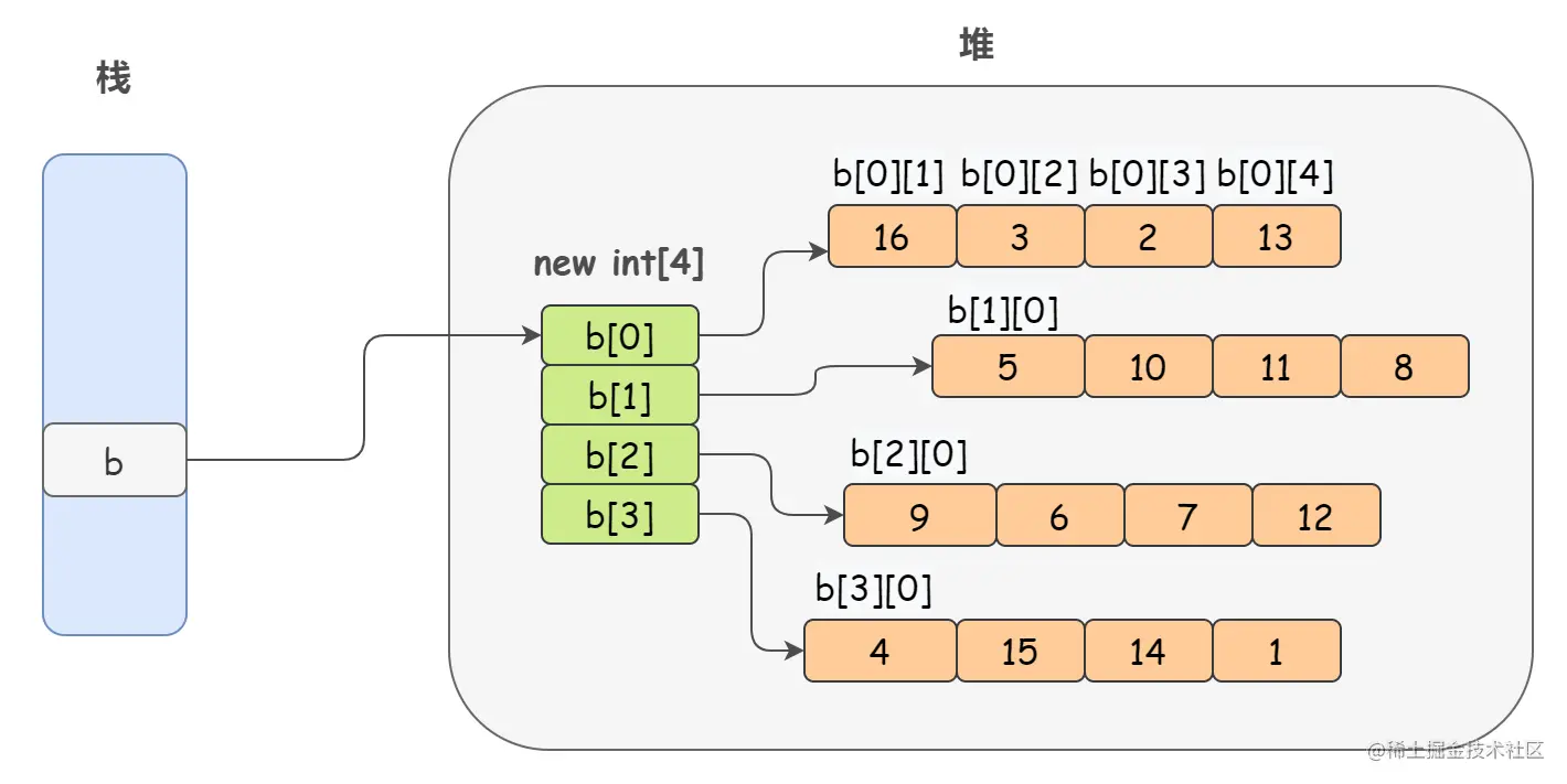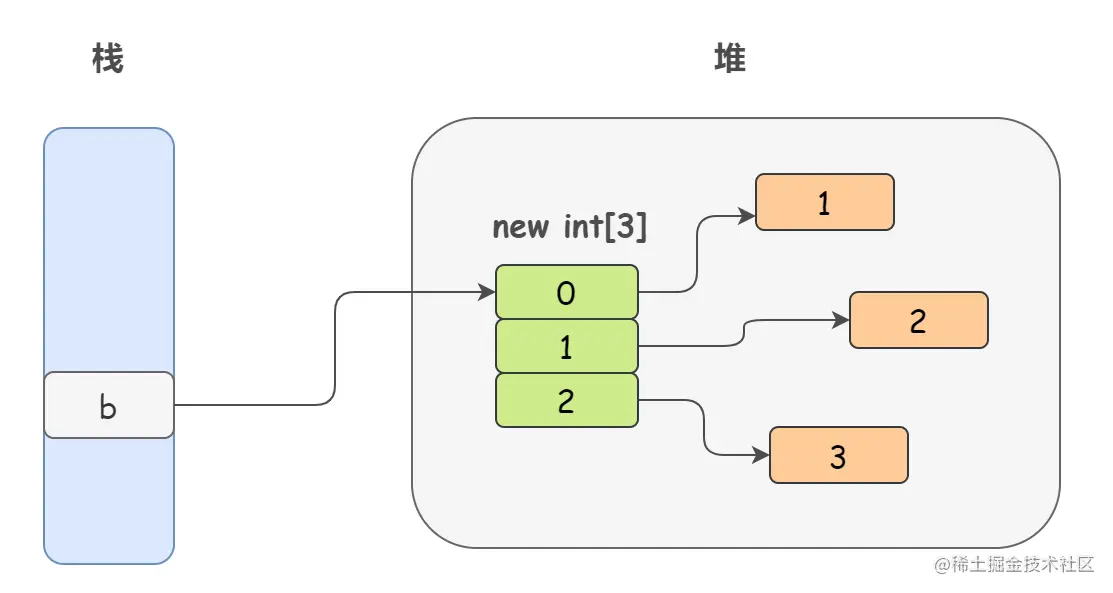 int 数组对象 b 存储在 栈中,而数组元素既然是 new 出来的,那当然是存储在堆中。只有当 JVM 执行 new int[] 时,才会在堆中开辟相应的内存区域。
