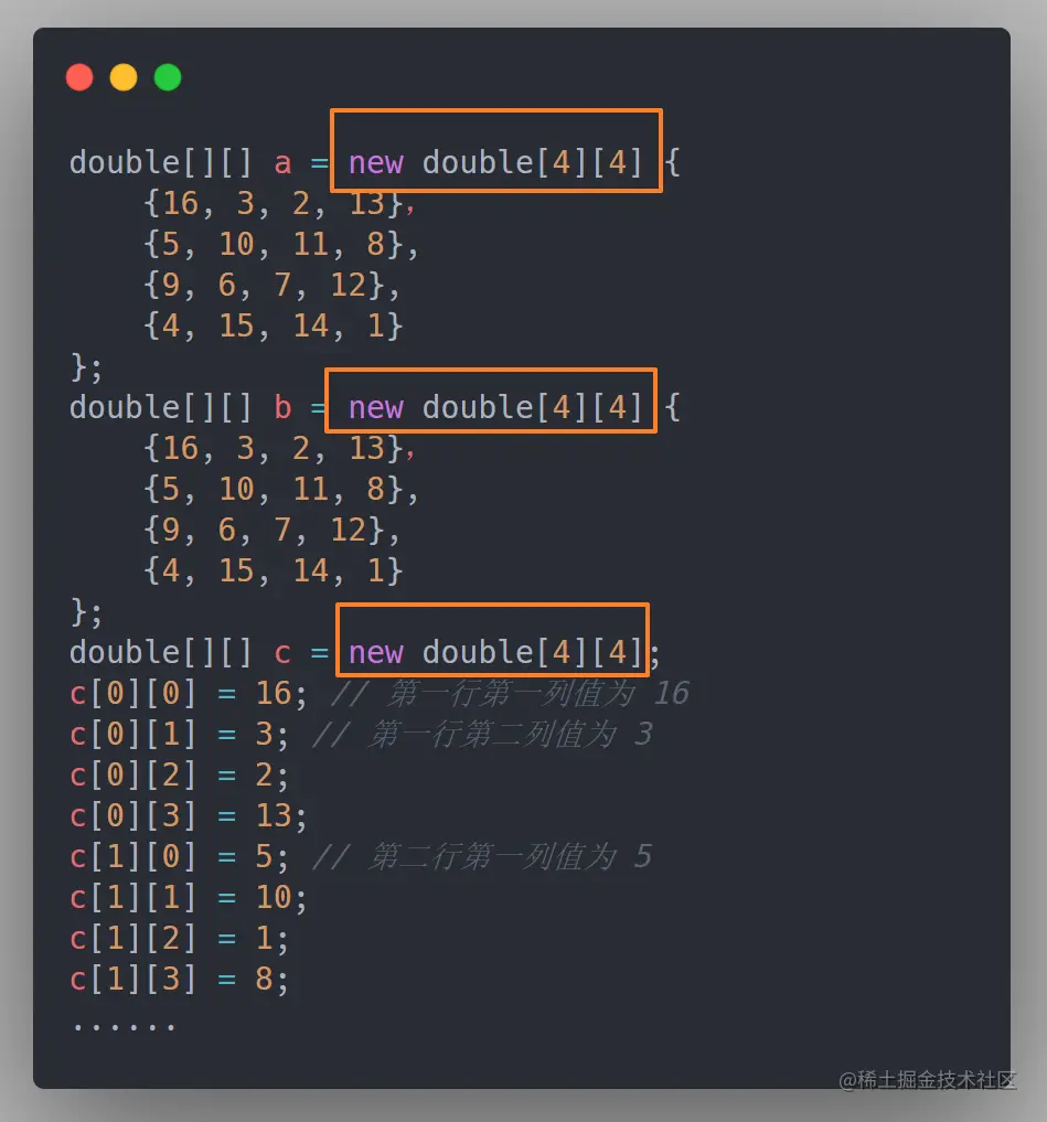 同样的,我们来反编译一下这三段代码的 .class 文件,底层它们的创建方式基本也都是一样的,不过有些细微的差别。编译器还是自动的给我们加上了 new 关键字,不过没有像一维数组那样把 c 的声明和赋值一体化了。