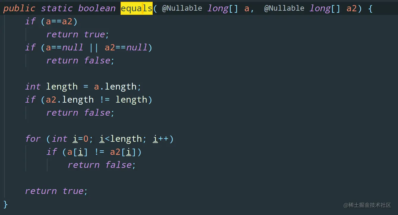 5)Arrays.equals - Arrays 类提供了重载后的 equals 方法,用来基于内容比较数组,数组相等的条件是元素个数和对应位置的元素都相等。
