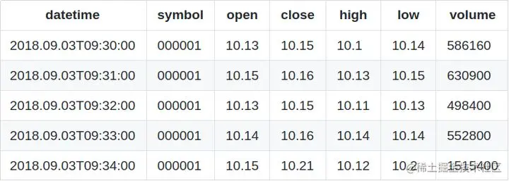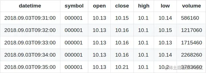 请注意,以上数据中,time列的精度为毫秒。若time列精度不是毫秒,则应当将 barMinutes*60*1000 中的数字做相应调整。