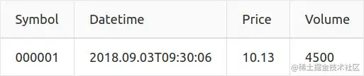 本例使用的模拟实时数据源为文本文件trades.csv。该文件包含以下4列(一同给出一行样本数据):