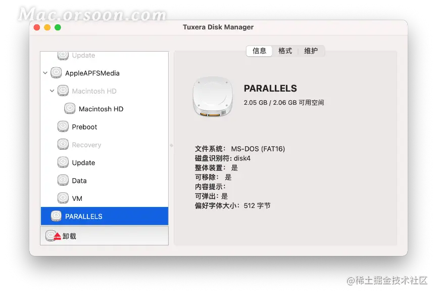 首先,将U盘接入Mac上,并打开Tuxera Disk Manager磁盘管理工具。在磁盘管理工具界面上,选择接入的U盘PARALLELS。在“信息”选项界面中,可以看到U盘的容量以及使用的文件系统为MS-DOS(FAT16)等信息。
