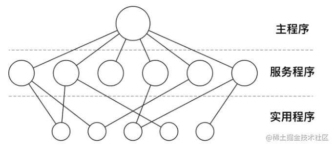 在单体系统中,对于每个系统调用都会有一个服务程序来保障和运行。需要一组实用程序来弥补服务程序需要的功能,例如从用户程序中获取数据。可将各种过程划分为一个三层模型