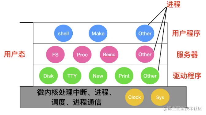 为了实现高可靠性,将操作系统划分成小的、层级之间能够更好定义的模块是很有必要的,只有一个模块 --- 微内核 --- 运行在内核态,其余模块可以作为普通用户进程运行。由于把每个设备驱动和文件系统分别作为普通用户进程,这些模块中的错误虽然会使这些模块崩溃,但是不会使整个系统死机。