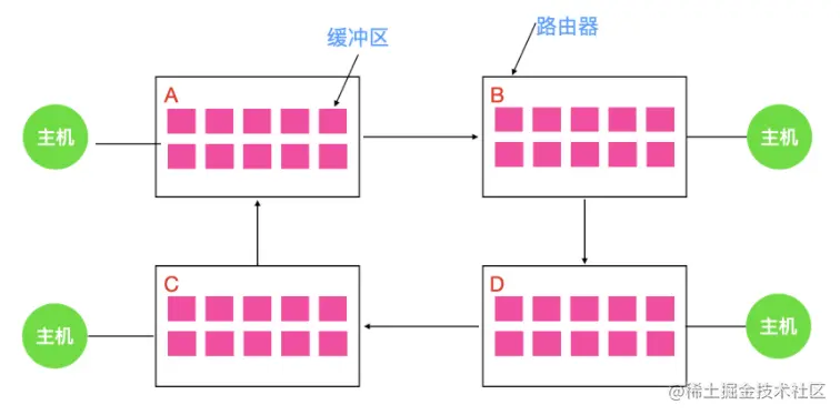 当一个数据包从主机进入路由器时,会被放入一个缓冲区,然后再传输到另外一个路由器,再到另一个,以此类推直到目的地。缓冲区都是资源并且数量有限。如下图所示,每个路由器都有 10 个缓冲区(实际上有很多)。