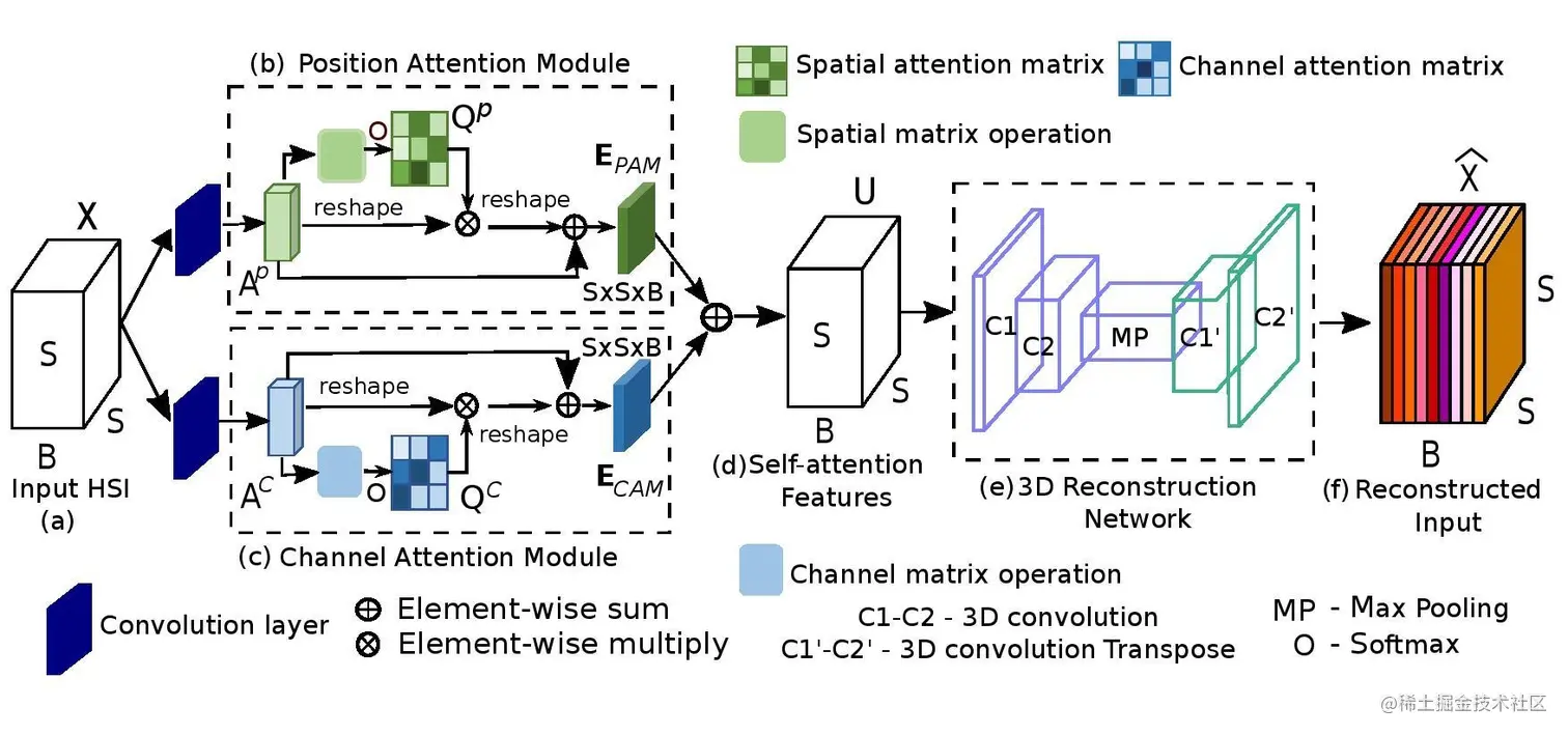 同样将波段选择问题视为光谱重建问题,本文的创新在于不仅应用了波段注意力机制(channel attention module),还增加了位置注意力机制(position attention module),所以叫做Dual-Attention, 因此能够重建三位高光谱图像数据立方体。