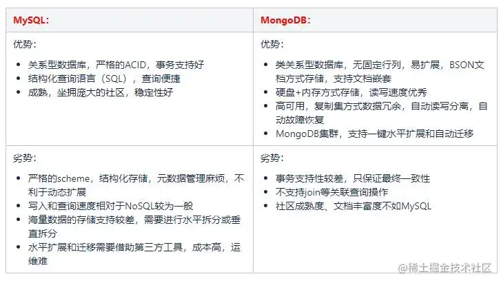 团队在数据库选型设计时,对比了多种主流的数据库,最终在 MySQL 和 MongoDB 两种存储之进行抉择。
