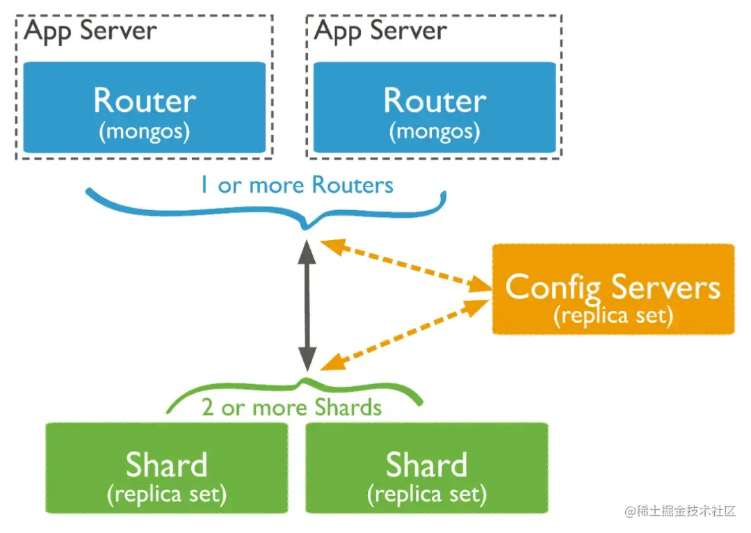 mongos:路由服务器,负责管理应用端的具体链接。应用端请求到mongos服务后,mongos把具体的读写请求转发到对应的shard节点上执行。一个集群可以有1~N个mongos节点。