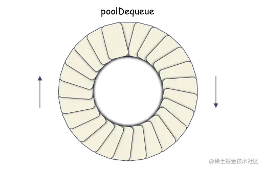 poolChainElt 是双链表的元素点,里面其实是一段数组空间,类似于 ringbuffer,Pool 管理的 cache 对象就都存储在 poolDequeue 的 vals[] 数组里。