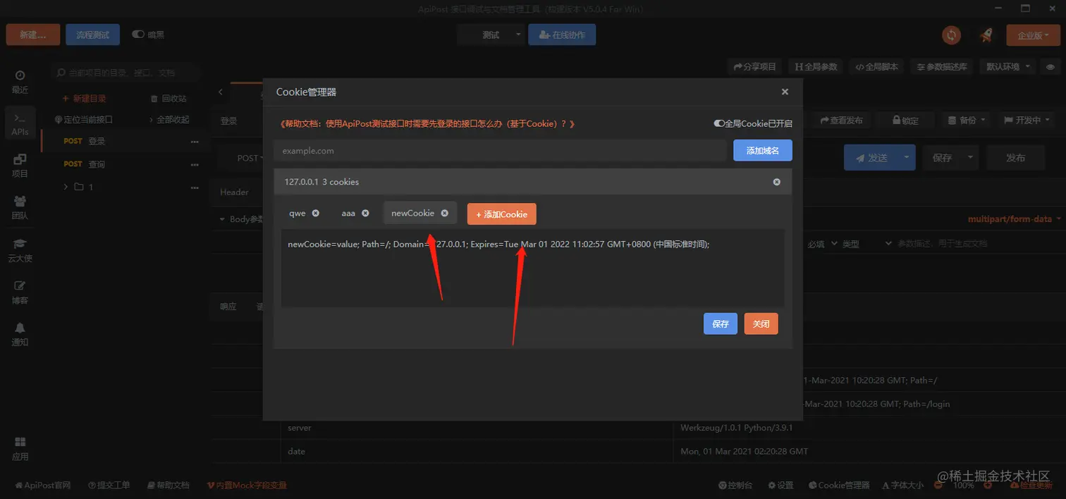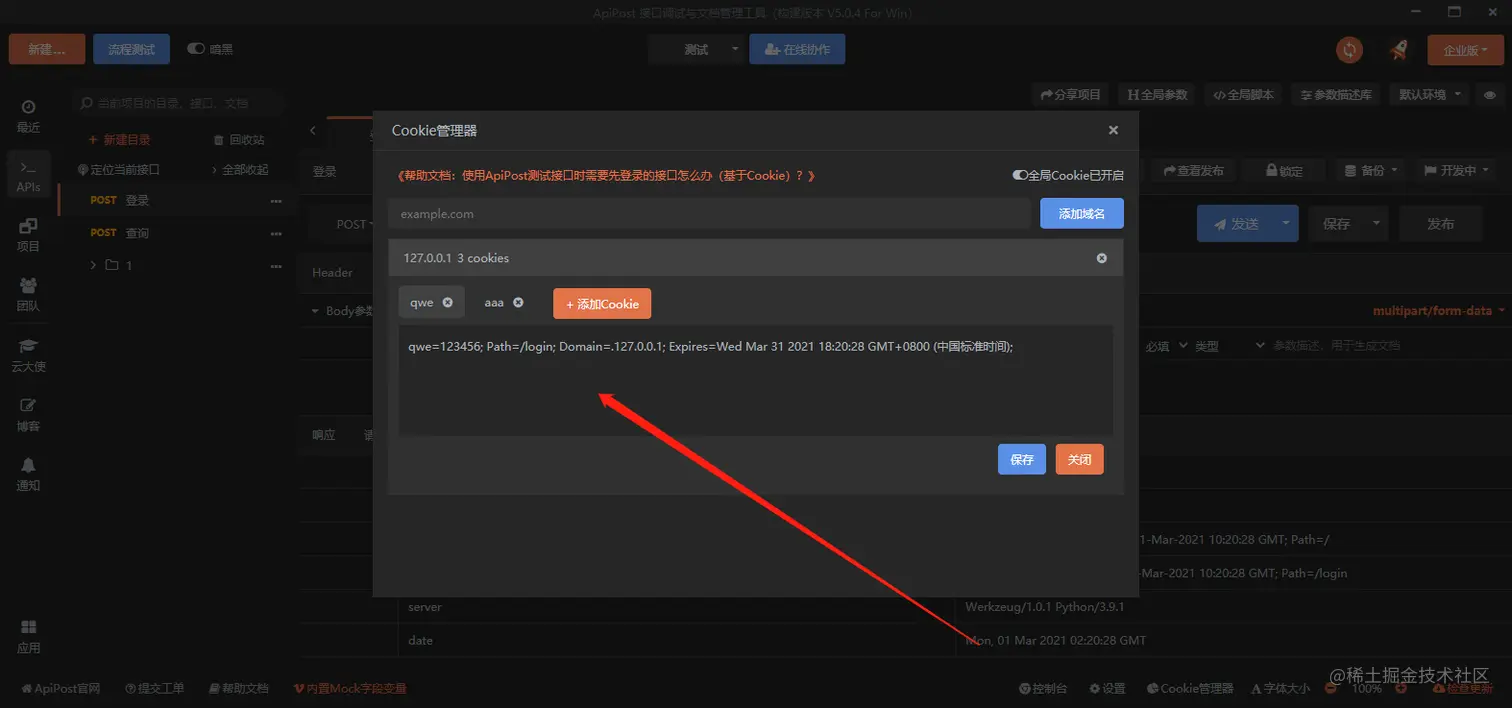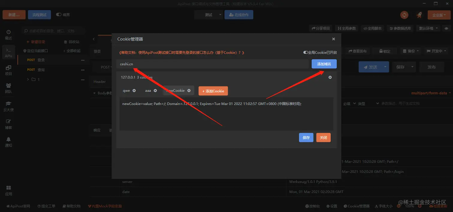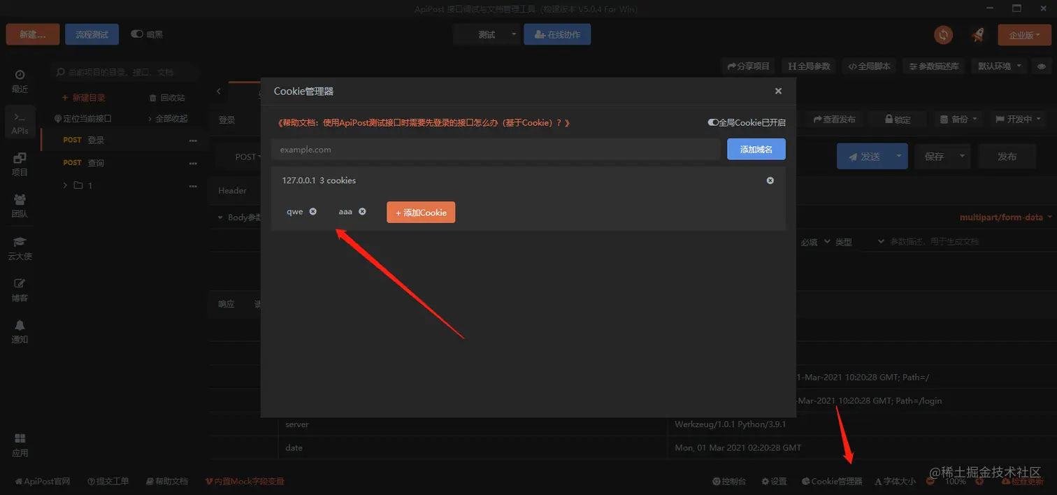接口测试和接口文档生成工具apipost中cookie管理器的作用是管理接口的cookie和自定义cookie