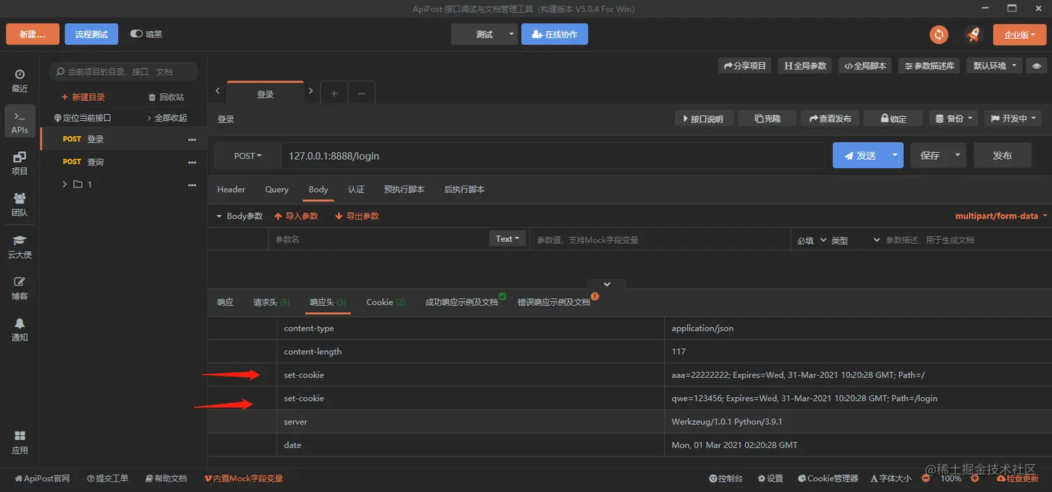 这里我们访问一个登录接口,然后查看服务器给我返回的set-cookie、如图:
